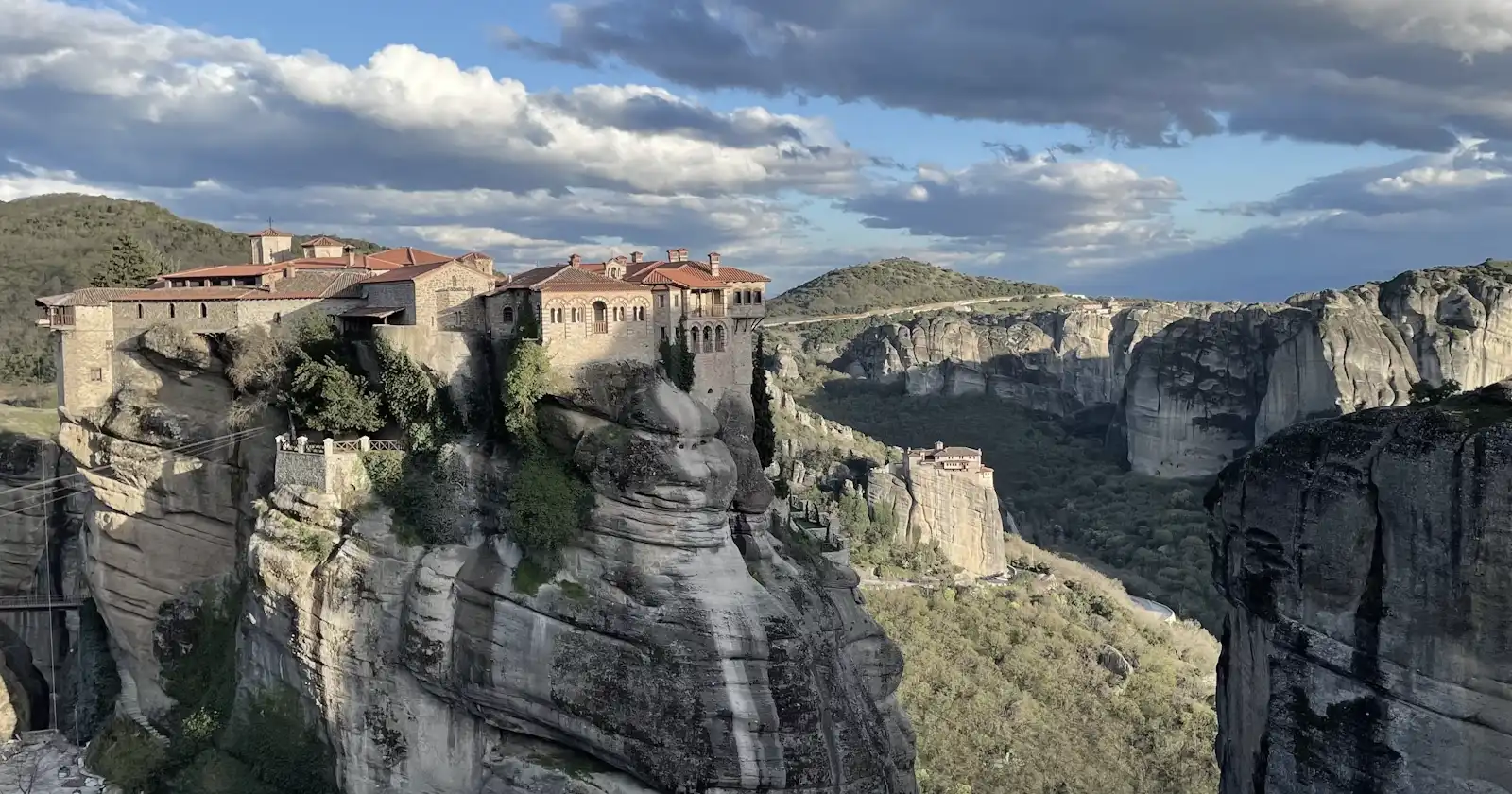 Cuando llegamos lo suficientemente alto, nos detuvimos en el Gran Monasterio de Meteora, donde tuvimos una hora para visitarlo por dentro. Me sorprendió lo actualizado y bien cuidado que estaba cada rincón del lugar. Después de explorar, llegó el momento de hacer nuestro último tramo, esta vez todo cuesta abajo y un poco más empinado.